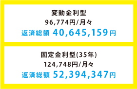 では具体例を挙げて比較してみましょう。比較するのは借入期間35年、元金3,500万円の住宅ローンを組んだ時の変動金利型と固定金利型です。変動金利型については、将来の変動幅についての予測が不可能なので、借入時点の金利が継続したと仮定して比較してみます。