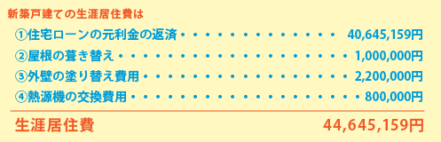 今のレベルの新築住宅は普段のメンテナンスをきちんと行っていれば、生きている間に立て替える必要はほぼありません。35年後に屋根の吹き替え費用として100万円、10年毎の外壁塗りが1回55万円、おなじく10年毎の給湯器等の熱源機の交換費用が20万円必要になります。