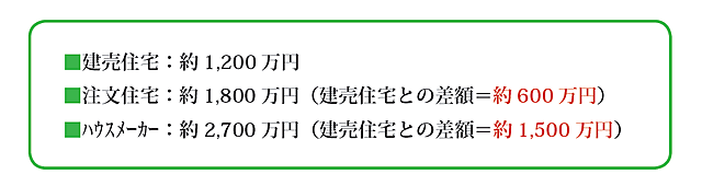まずはその値段です。一般的な建売住宅は延床面積が95~100㎡の建物だとおよそ1,200万円という価格になります。しかし世間で知られている大手住宅メーカーでの注文住宅となると95~100㎡の建物で2,700万円程と建売住宅の2倍以上もの価格にもなるのです。また大手住宅メーカーではなく、工務店を利用しての注文住宅の場合でも、同じサイズの家で1,800万円程となります。つまり建売住宅よりも600万円も高くなってしまいます。