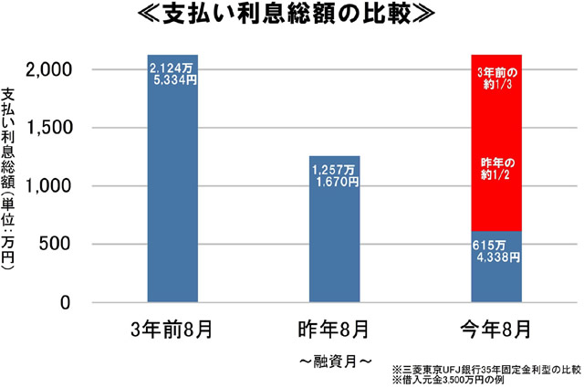 3年前の8月に3,500万円の住宅ローンを組んだ方と今年8月に同じ金額で住宅ローンを組んだ方とでは、35年間の支払い利息総額で、21,245,334円-6,154,338円=15,090,996円もの差が生まれたということです。昨年8月との比較でも、12,571,670円-6,154,338円=6,417,332円もの差になります。