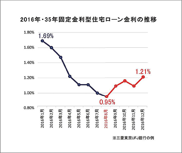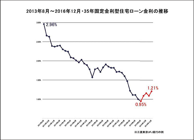 簡単な話、昨年8月に三菱東京UFJ銀行の35年固定型住宅ローンで融資を受けた方の金利は35年間ずっと0.95%のまま、昨年12月に融資を受けた方の金利は35年間ずっと1.21%のままということです。