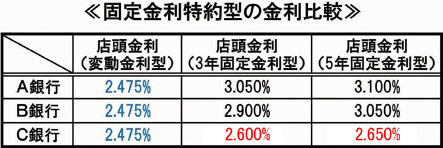 A・B・C各銀行とも、変動金利型住宅ローン店頭金利は同じです。しかし、3年固定、5年固定金利を見てみるとC銀行は特に低い金利になっています。このように、固定金利特約型の金利をあえて低く設定している銀行があります。このような傾向の強い銀行を選ぶことによって、将来の金利変動に備えるということも銀行選択のひとつの切り口と言えます。