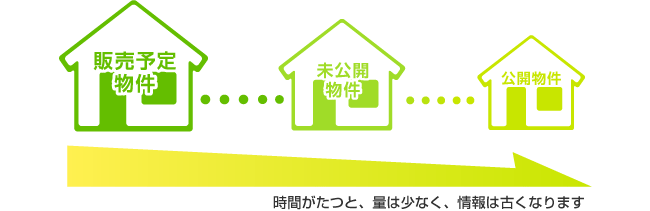 このような、1番早い段階の物件情報が「販売予定物件」です。この結果、マイホームプランふなばしではお客様に対し「現在販売中の物件」のみならず、「今後販売する予定の物件」を含めた、まさに「すべての物件」の中から最もご希望物件とのマッチング度の高い理想的なお住まいに出会うことができるのです。