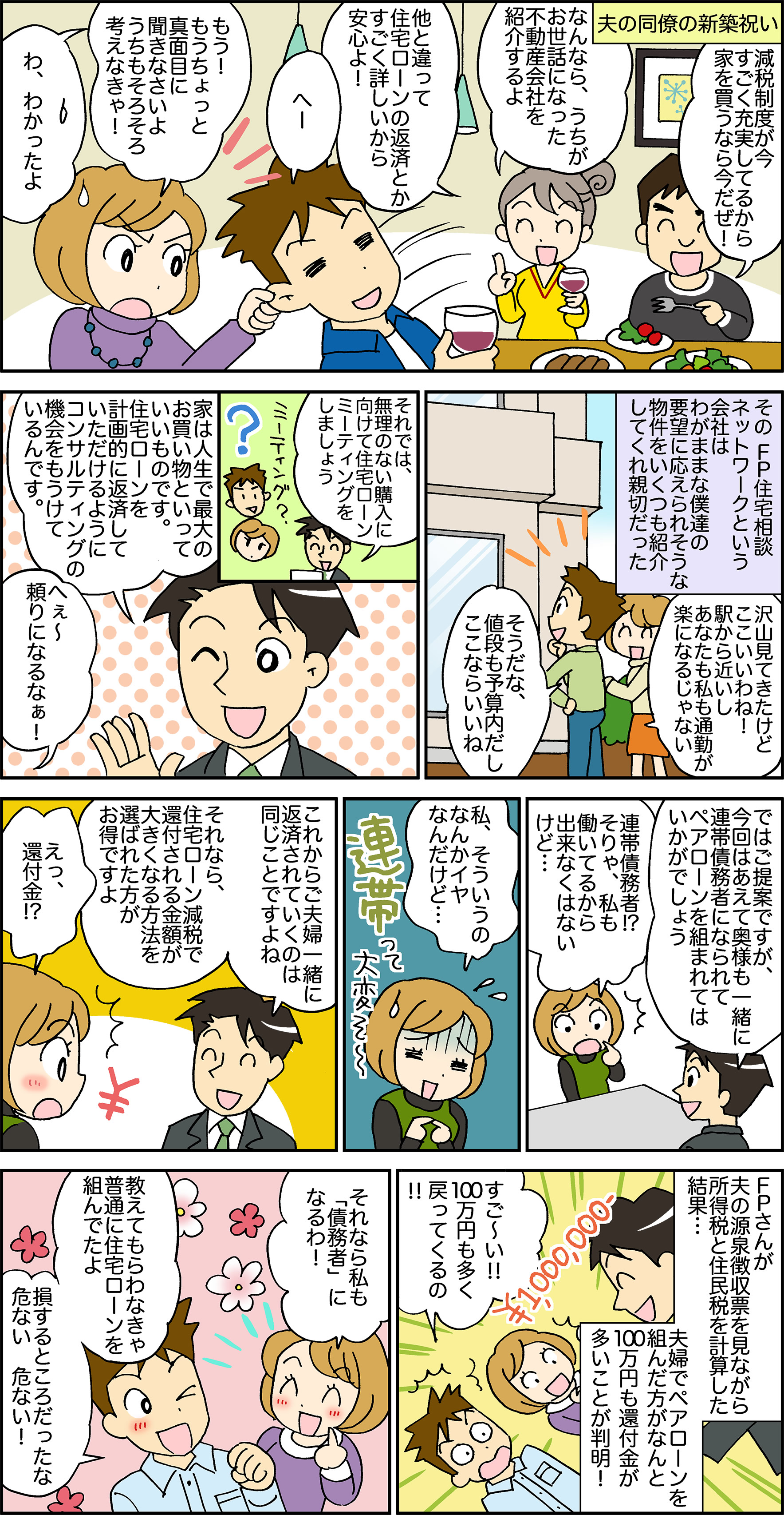 住宅ローン減税についてはローンを組んでから10年間、所得税全額と住民税の一部から還付を受けることができる制度です。一般的な新築一戸建てを購入した場合、最大で年間40万円、10年間で400万円の税額控除が受けられます。但し、仮に年間40万円の還付を受ける権利があったとしても、あくまでもおさめた税金を返してもらう制度ですので例えばご主人様だけで納めた税金が30万円しかなければそれが上限となってしまうのです。そこで今回のケースのように共働きをされている奥様に連帯債務となって頂くことにより、奥様の納めている税金も還付の対象にすることが出来るのです。知っているか、いないかだけで大変な差ですね。もちろん、将来の退職リスクや団体信用生命保険の補償範囲の変動などリスクになる可能性についても十分にご理解を頂く必要がありますので実際に住宅ローンをお申込みになる際にはファイナンシャルプランナーなどの専門家に十分に相談をされて納得の上で判断をすることが大切です。