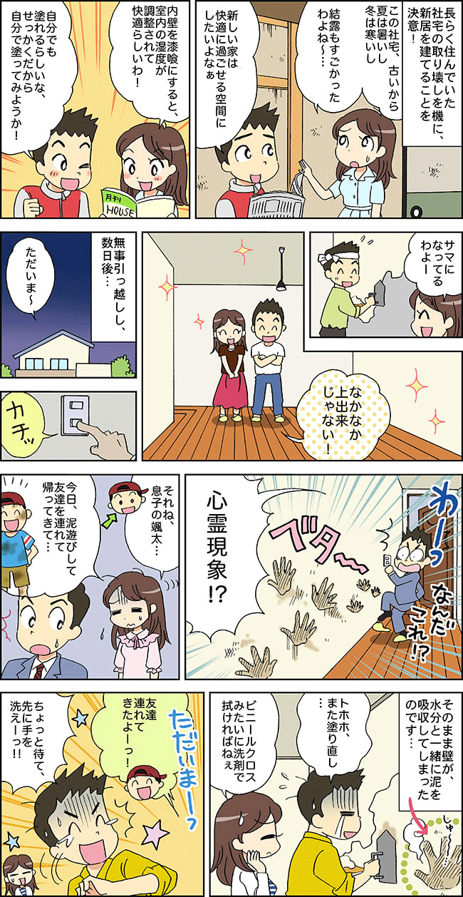 よく話を聞いてみると、日中息子が公園で遊んだあと友達を連れて家へ戻ってきた際、泥だらけの手で壁をベタベタと触り、そのまま壁が水分と一緒に泥を吸収してしまったとの事でした。