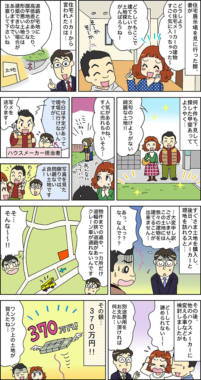 あまりにも衝撃的過ぎて詳しく覚えていませんが、南道路で日当たり良好、道路と宅地の高低差なし、しかも真四角でケチの付けようがない土地のはずですが、実は物件までの道中、一か所だけ道幅の狭い所があり、そこをクレーン車が通れない、との理由だったのです!!