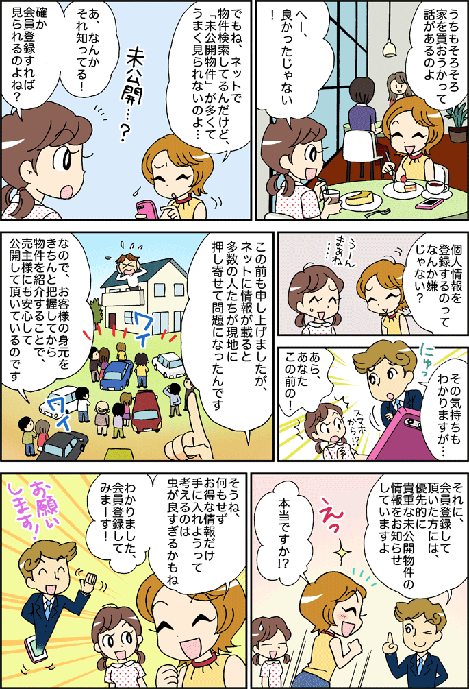 しかし中には「個人情報を記入しなくてはいけないので会員登録はしたくない」という方もいらっしゃいます。最近は個人情報にまつわるトラブルが色々あるので、このようなお客様の気持ちもよく理解できます。 しかし是非一度、弊社HPの「お客様の声」をご覧になってください。当社で未公開物件を含めた豊富な情報の中から理想のマイホームを手に入れた方の本物の声を多数掲載しております。未公開物件には広告宣伝できない優良物件が多数ありますので、会員登録をしてこれらの情報をいち早く、優先的に集めることはマイホーム探しにはとても有利になるはずです。もちろん「探し始めだから物件情報の収集に使いたい」という状況でも全く問題ありません。